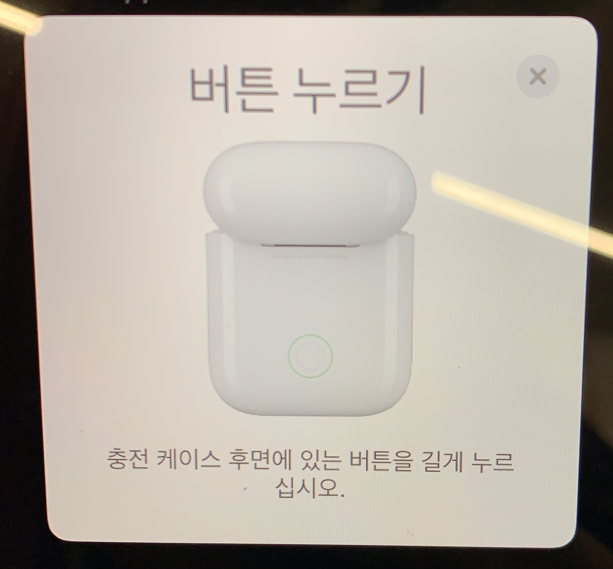 에어팟 뚜껑을 연 상태에서 에어팟 뒷편의 버튼을 꾸욱 누르면 에어팟 중앙의 불빛이 하얀색으로 나오게 됩니다!